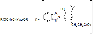 化學(xué)名稱 | 紫外線吸收劑UV-1130為苯并三唑混合物:b-[3-(2-H-苯并三唑-2-基)-4-羥基-5-叔丁基苯基]-丙酸聚乙二醇300酯,雙-{b-[3-(2-H-苯并三唑-2-基)-4-羥基-5-叔丁基苯基]-丙酸}-聚乙二醇300酯,聚乙二醇300 | ||||||